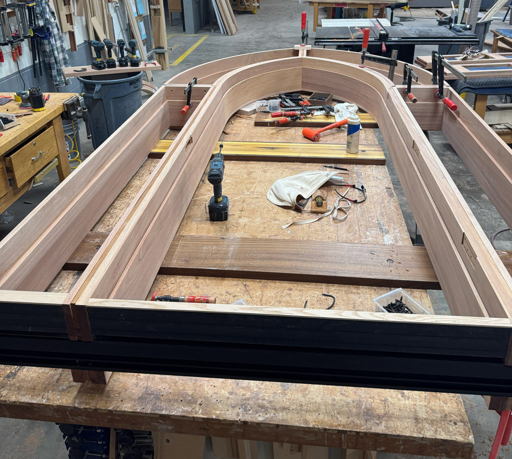 See how a custom African Mahogany archway was built to honor the architecture of a historic stone church—down to the grain direction and curve of the transom.